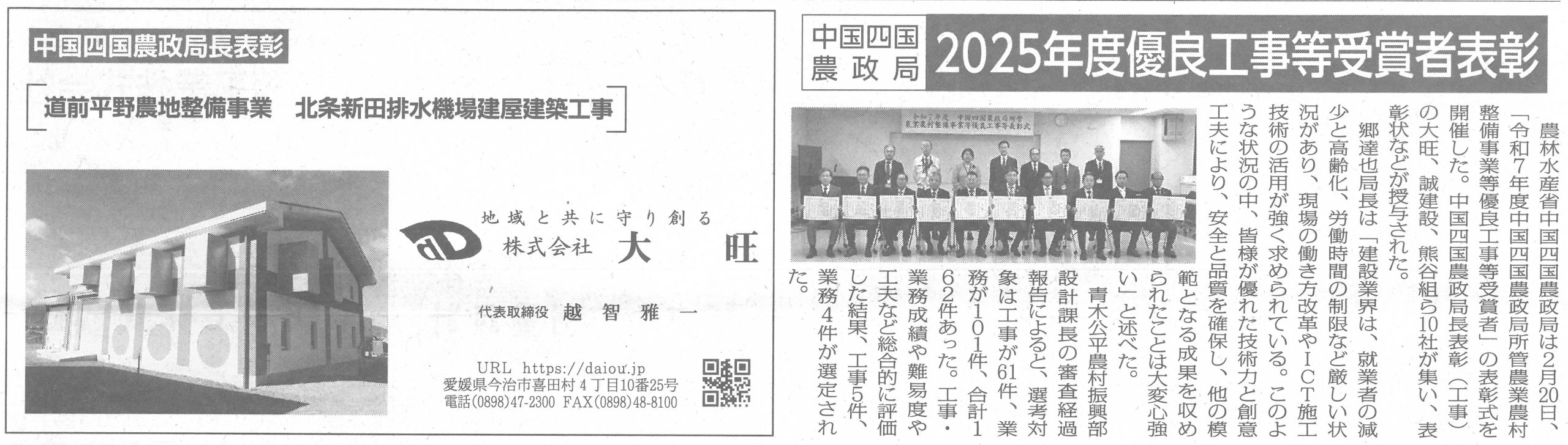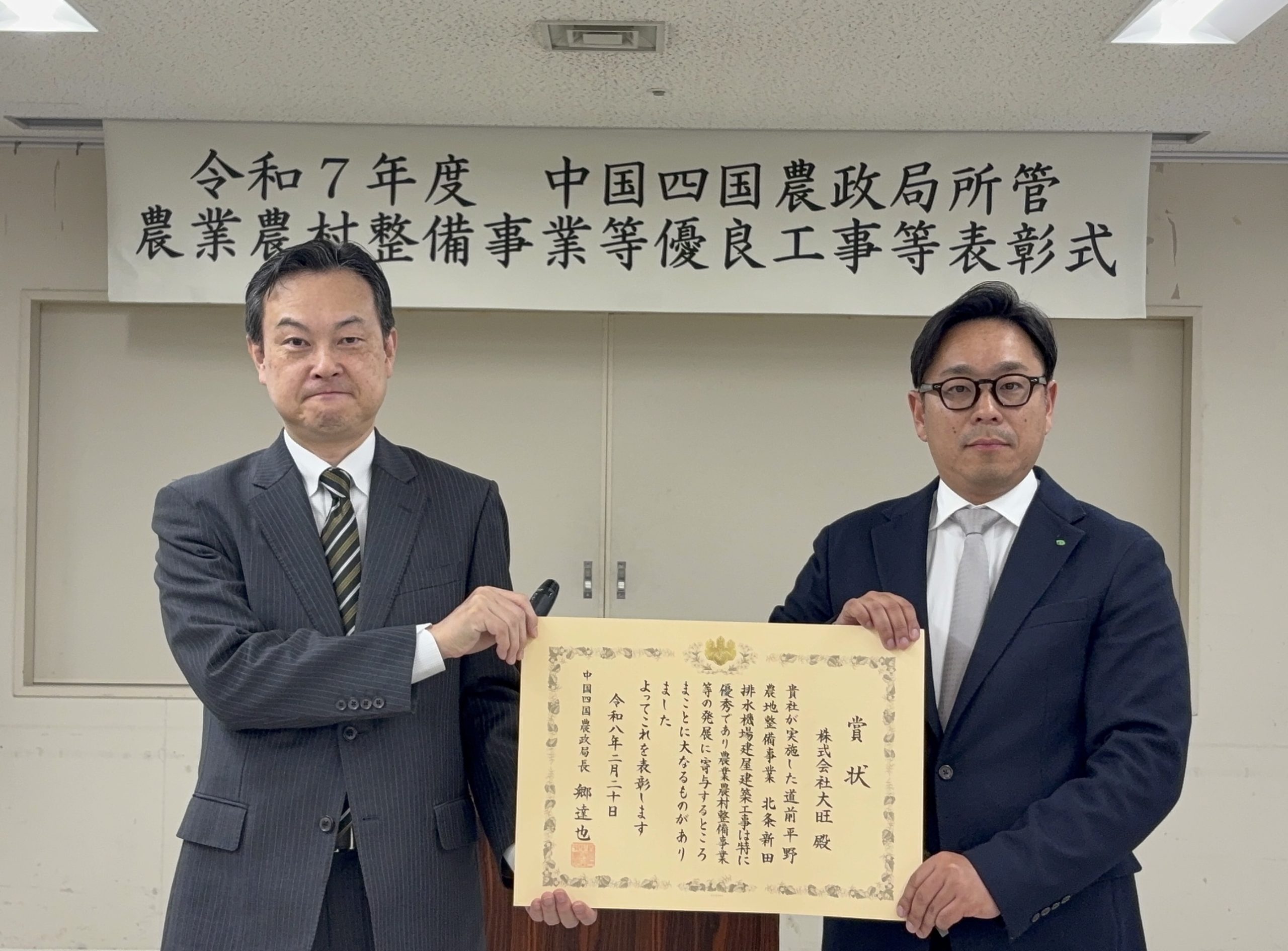 中国四国農政局より「令和7年度農業農村整備等優良工事表彰式」にて、
